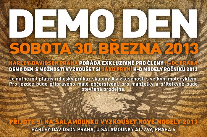 HARLEY-DAVIDSON PRAHA POŘÁDÁ EXKLUZIVNĚ PRO ČLENY H-DC PRAHA DEMO DEN S MOŽNOSTÍ VYZKOUŠET SI JAKO PRVNÍ H-D MODELY ROČNÍKU 2013